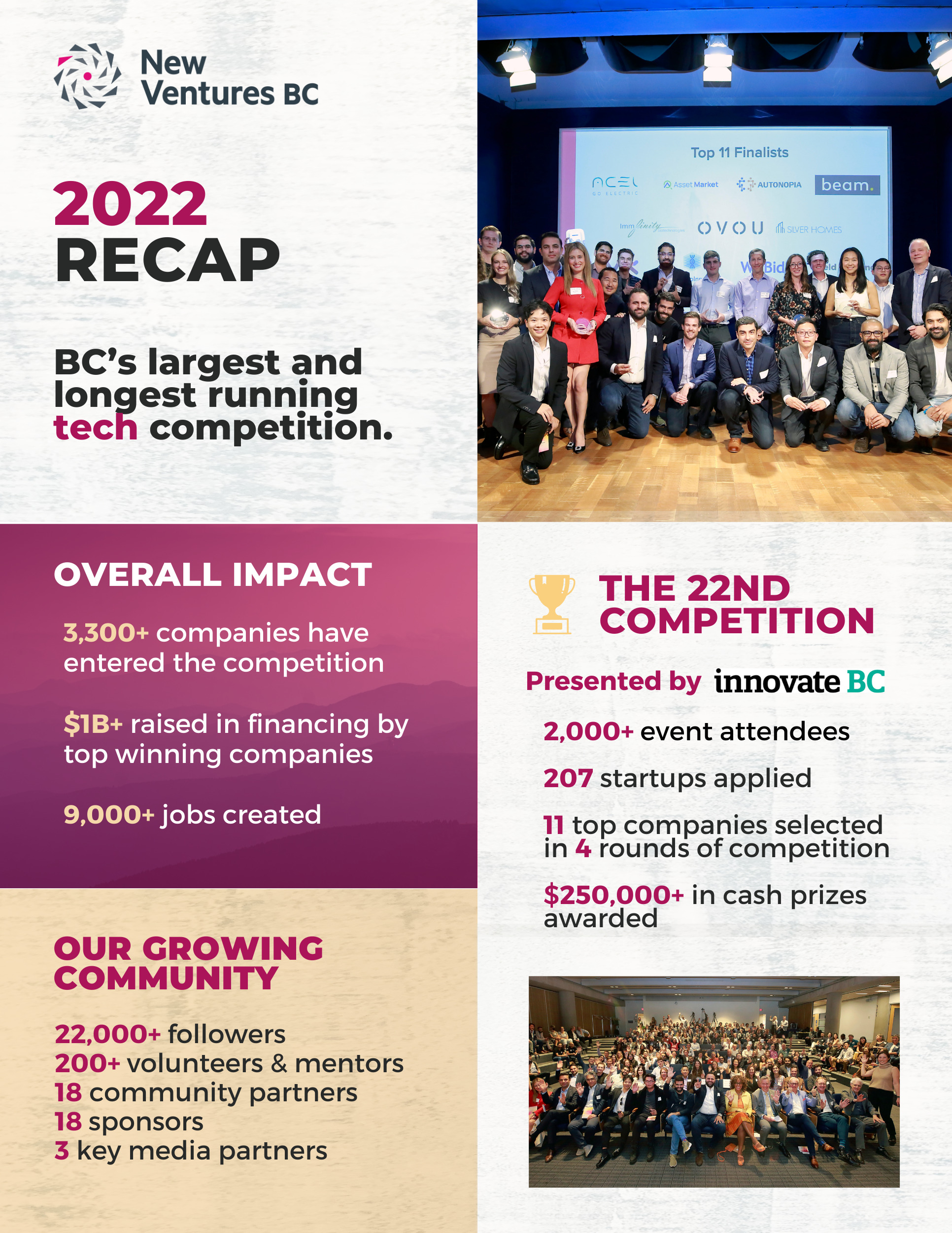 2022 was New Ventures BC’s 22nd year!  Thank you to our community of start-ups, volunteers, and sponsors for letting us deliver on our mission: to recognize, encourage, and develop entrepreneurship and innovation in B.C.’s start-up technology sector. Join us as we reflect on some of our biggest highlights.