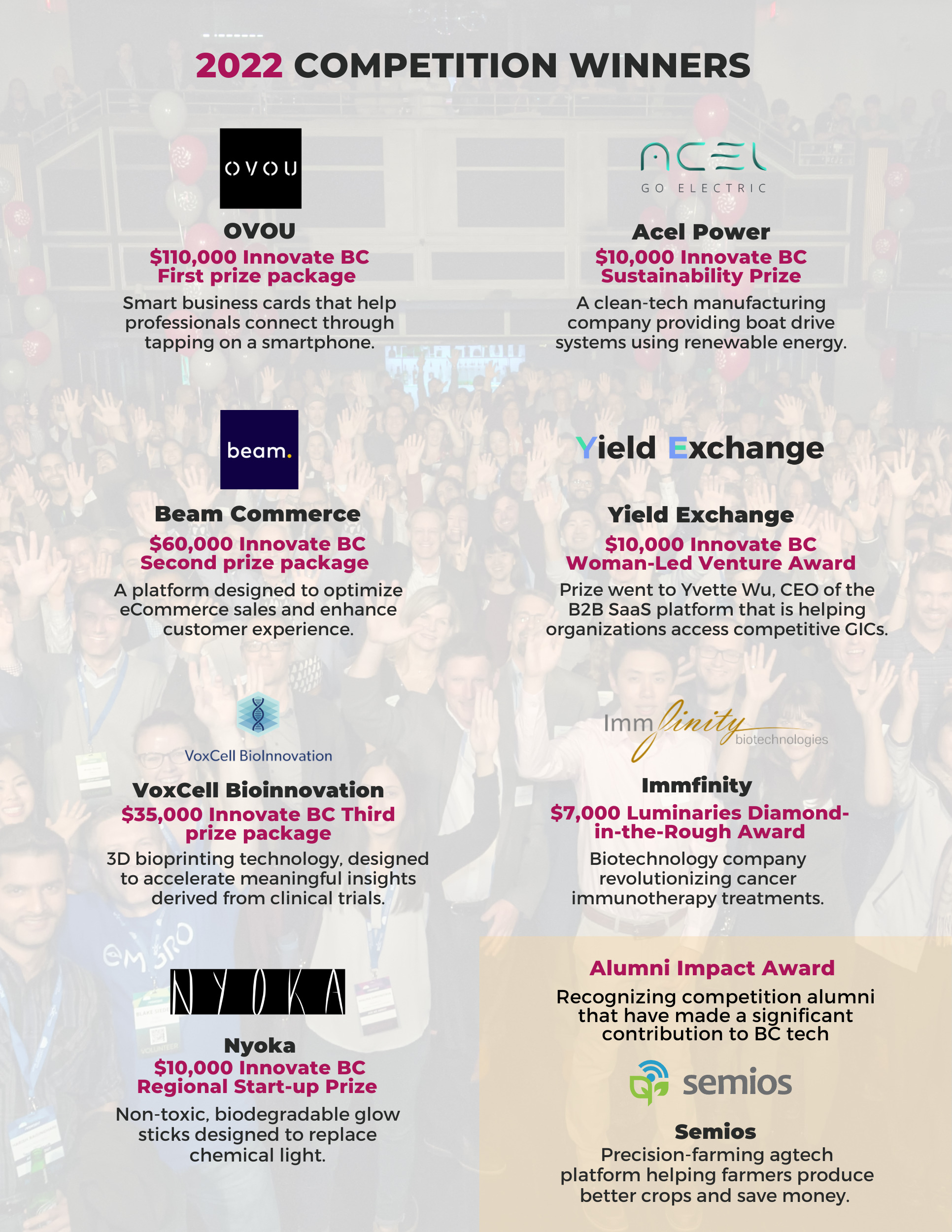 This year, we received over 200 applications, with thousands of BC tech startups joining our online educational seminars. We awarded over $250,000 in cash and prizes at our Awards. Congratulations to the top 3 placing ventures: OVOU, Beam Commerce and VoxCell Bioinnovation. Congratulations as well to Semios, winner of the annual Alumni Impact Award!