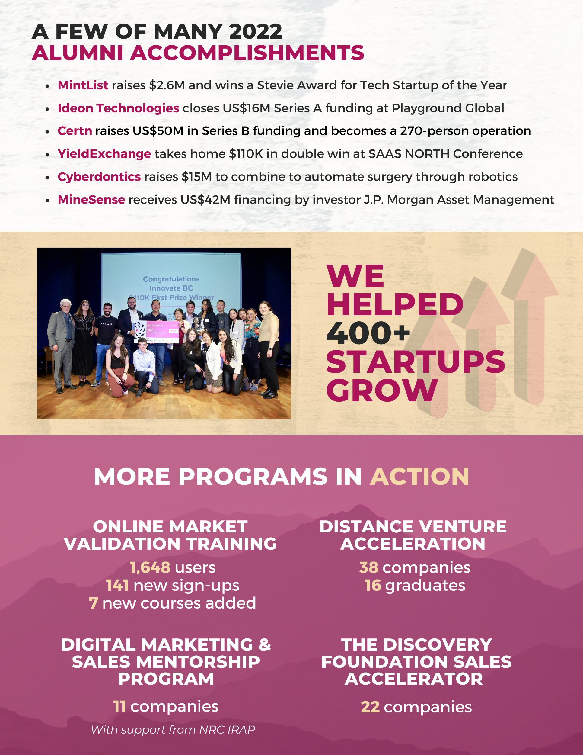 Thank you to Innovate BC for supporting our Distance Venture Acceleration Program, which provides 1:1 mentorship with an an Executive in Residence and Market Validation Training to many new early-stage startups across the province. This year our program worked with 38 companies and 16 companies graduated.
